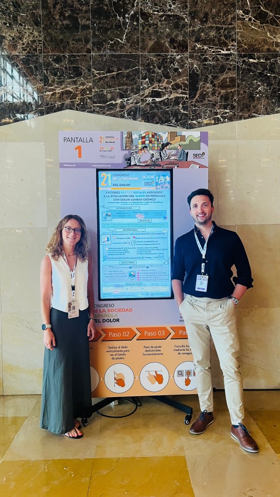 Por su parte, la fisioterapeuta y Dra. Marta Moreno nos presentó a través del póster titulado “Factores biopsicosociales asociados a la evolución del sueño en personas con dolor lumbar crónico”, con datos procedentes de su reciente tesis. Dicho estudio identifica la relación entre diversos factores contextuales (individuales, sociales y psicológicos) y la calidad del sueño, un aspecto que últimamente se le está dando una importante relevancia en procesos de dolor crónico.